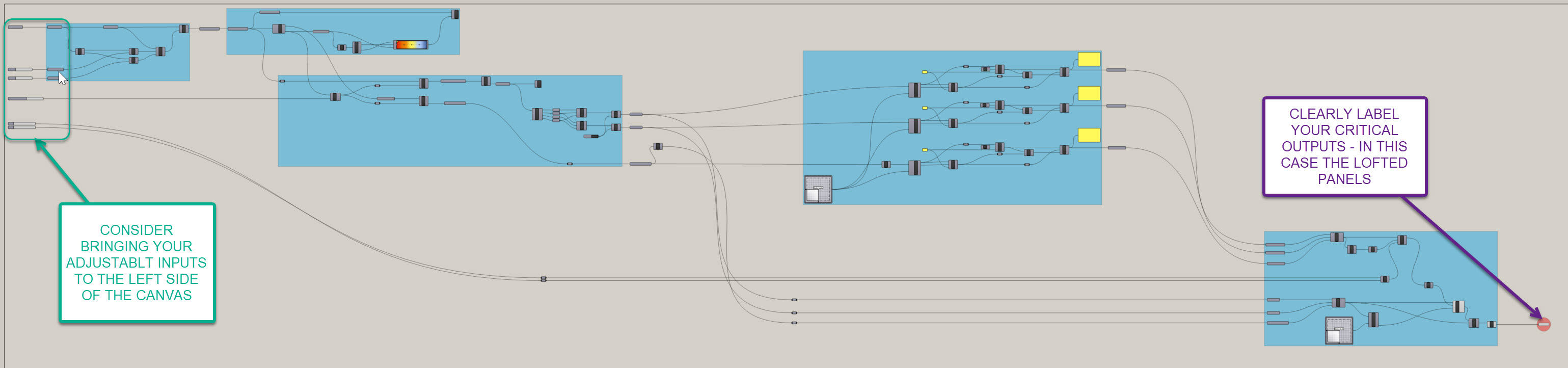 Also try to avoid plugging multiple output wires into a single input wire - it is hard to reconfigure, add, and remove later. Use a