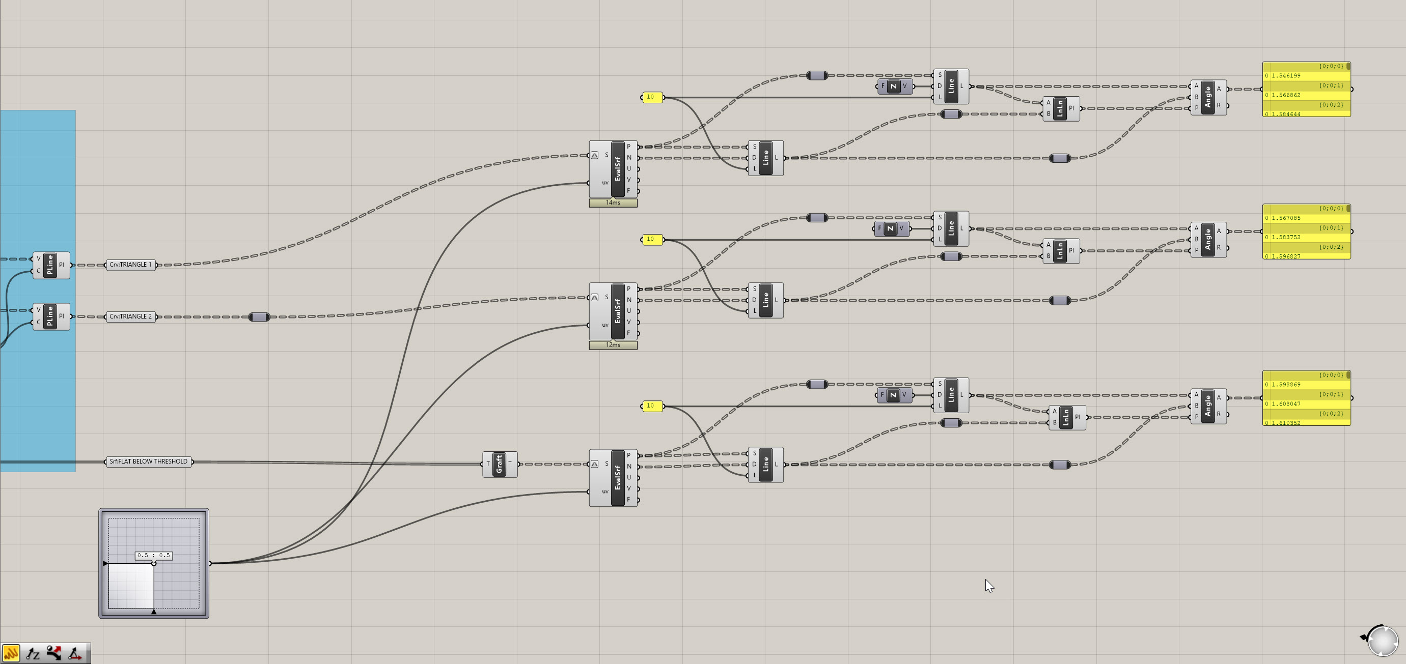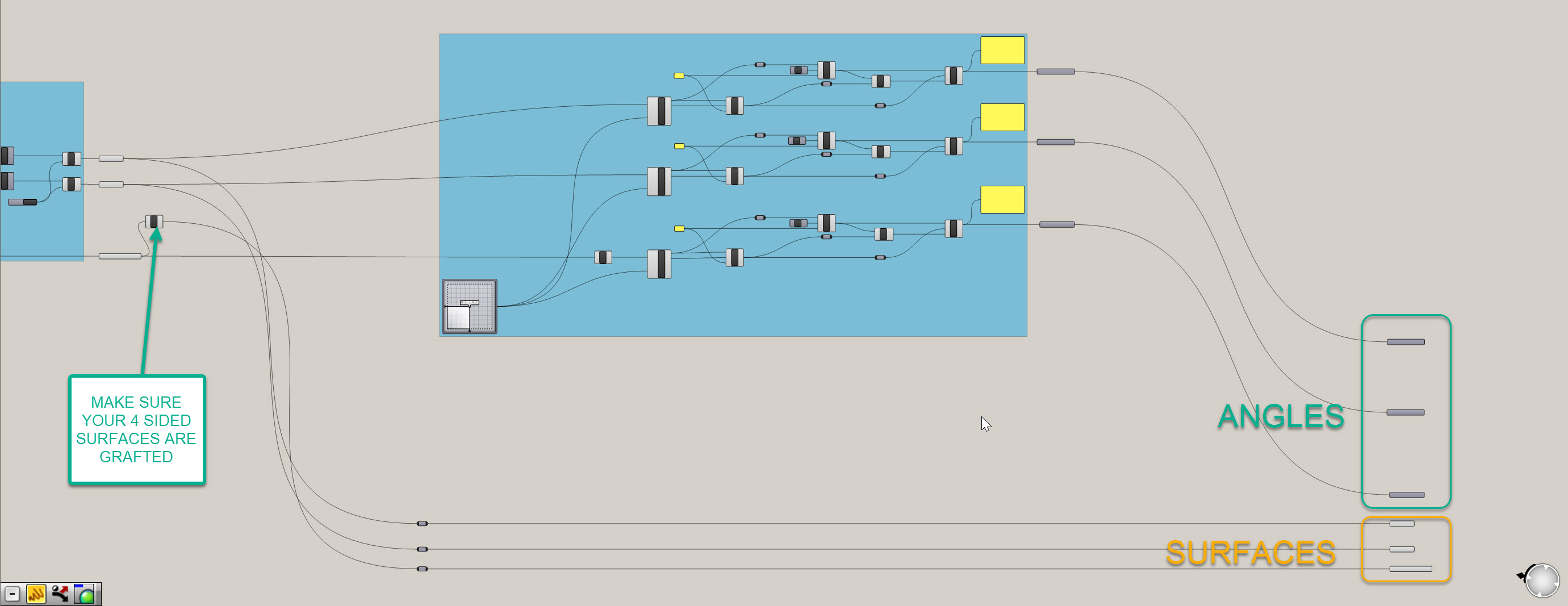 To get yourself set up for the final portion, go ahead and create number containers for all of the angle outputs, and also duplicate the surface outputs and bring them forward. What we're going is extracting our critical data and geometry and isolating it elsewhere in the definition, so we don't get mixed up and can clearly create a new function. Make sure you're using the grafted 4 sided surfaces, or re-graft if needed. Don't be afraid of white space on your Grasshopper canvas - it is easier to read and gives you space to work.