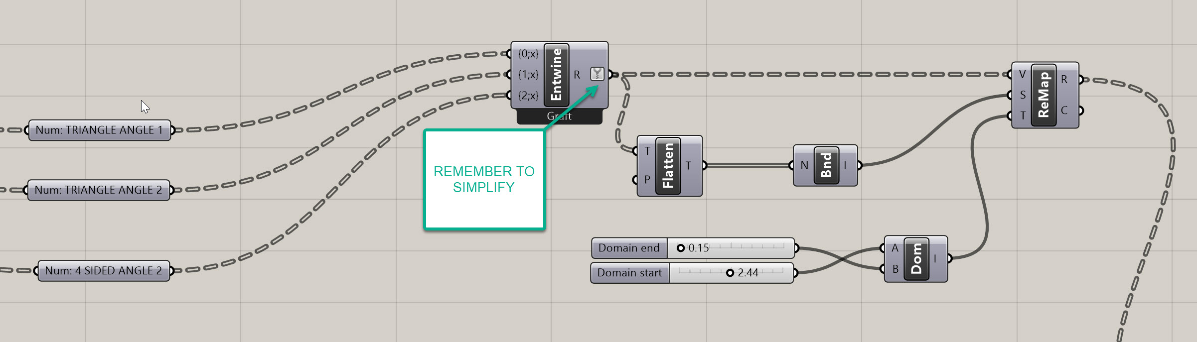 Entwinecomponent that hols your angles. You can do this by right-clicking on the R and turning on Simplify. This removes unnecessary branches from our data tree and will help us align our two trees later on. Then, take this simpilfed data and plug it in to the V on theRemap Numbers (ReMap). - Now we need to create a source domain - to do this, we need to flatten our angles that are coming out of our