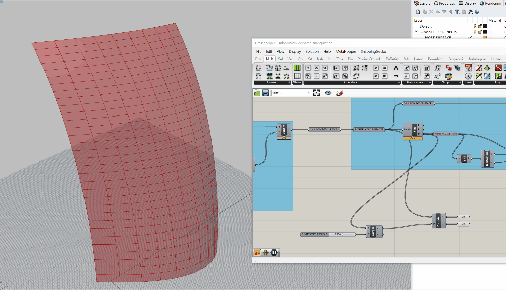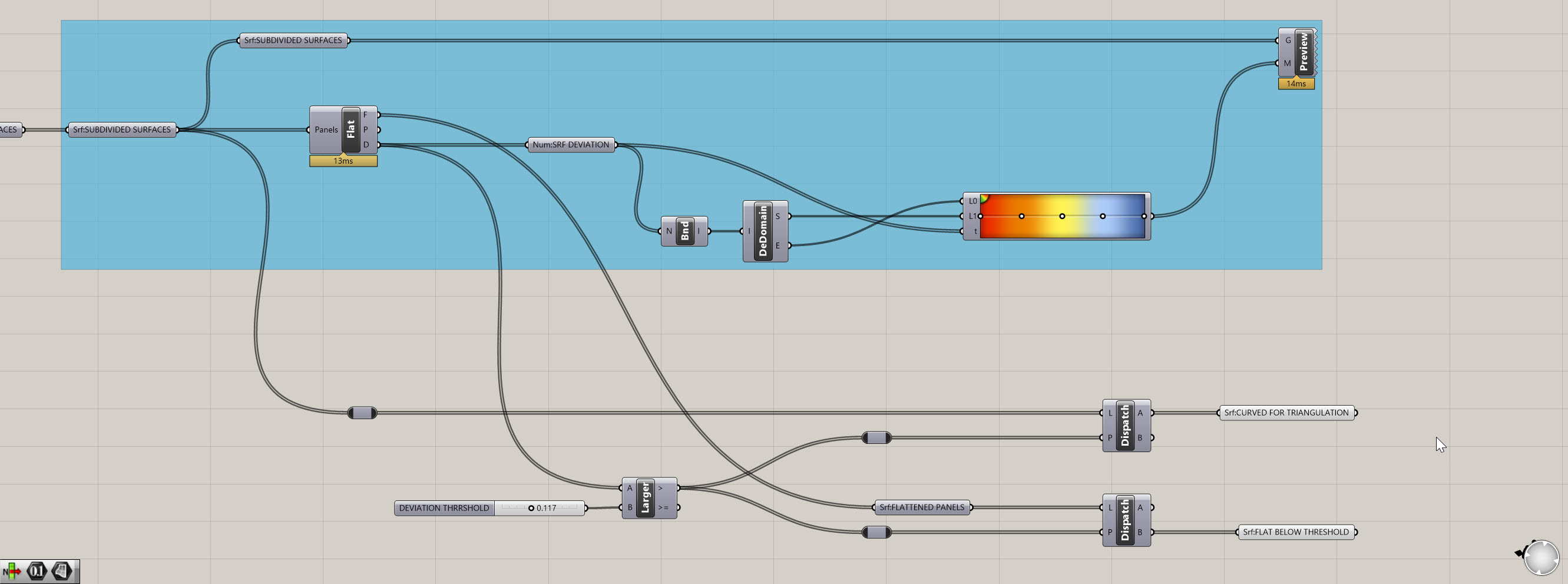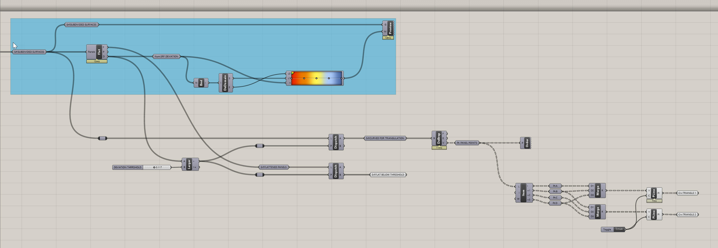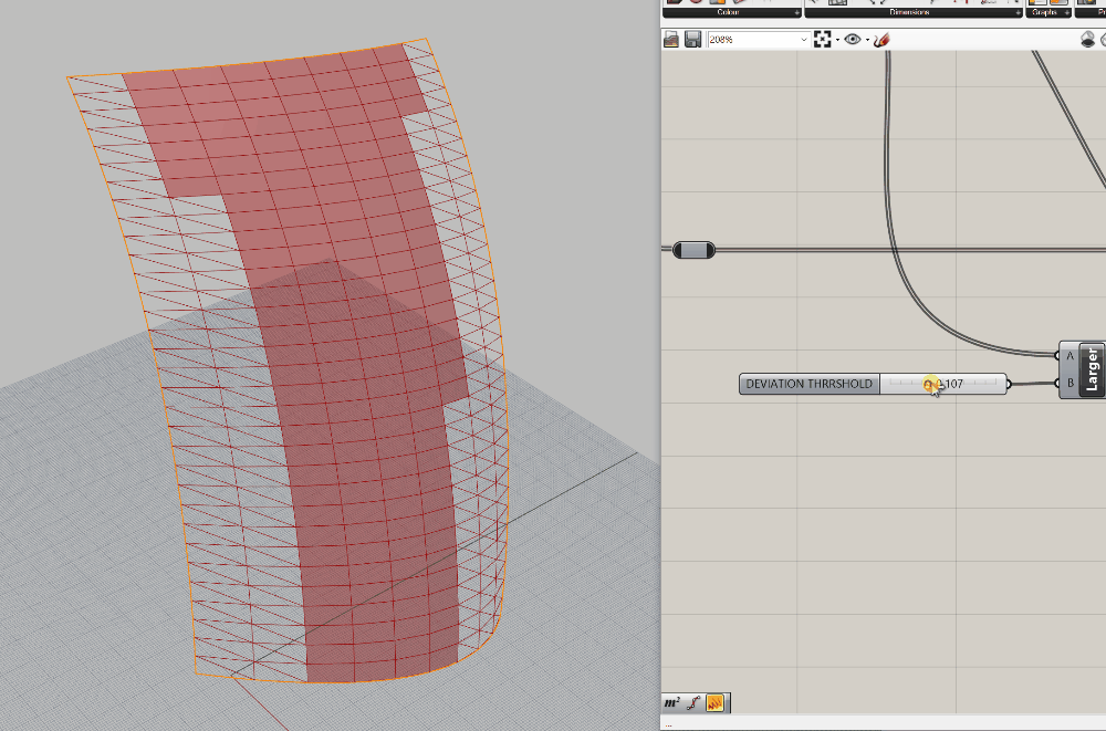 Let's start with seperating out those pesky overly-curved panels. For this, we're going to rely on another tried and true Grasshopper component, Dispatch.