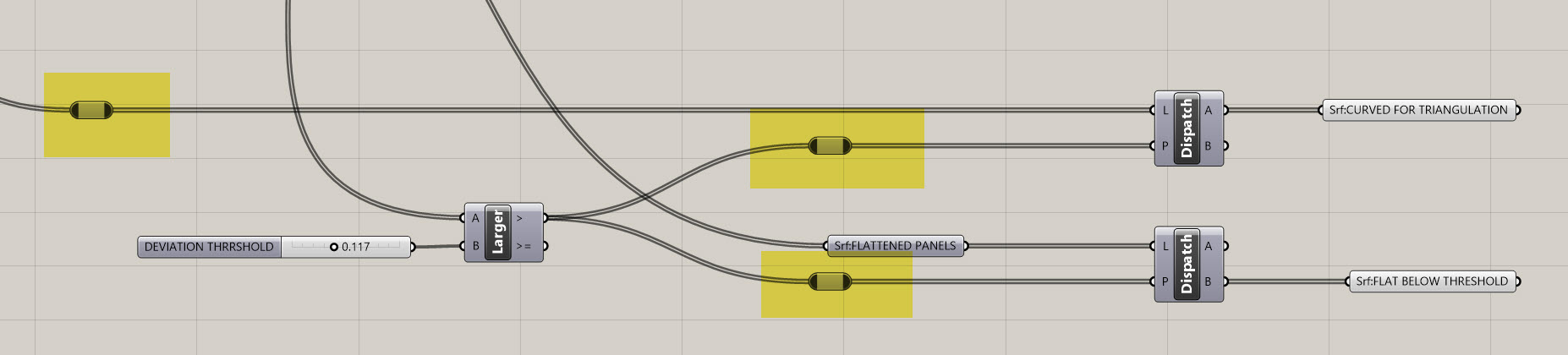Dispatch. I'm going to rename theSurface (Srf)coming out of the A toSrf:CURVED FOR TRIANGULATIONand I'm going to delete theSurface (Srf)coming out of the B. Then, I am going to copy and paste thisDispatchto create another another one. However, I want to keep the P input on this one, but I'm going to swap out the L for the flattened panels coming out of myFlatness Check (Flat)component. It should look something like below: