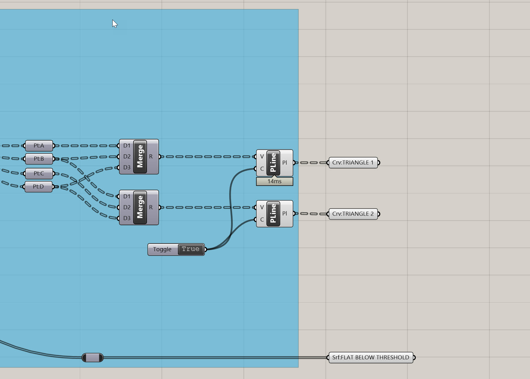 Mergecomponent, and plug in points A, B, D into inputs D1, D2, and D3, in that order. This basically creates a new series of lists that contain the three points we need for a triangle. Create a newMergecomponent, and plug in B, C, and D in order. Create aPolyline (PLine)and plug the firstMergeinto it. Repeat this process for the 2ndMerge. Finally, create aBoolean Toggle (Toggle)component, make sure it is set for True, and plug it in to the C inout on bothPolyline (PLine). This portion of your definition should look something like this: