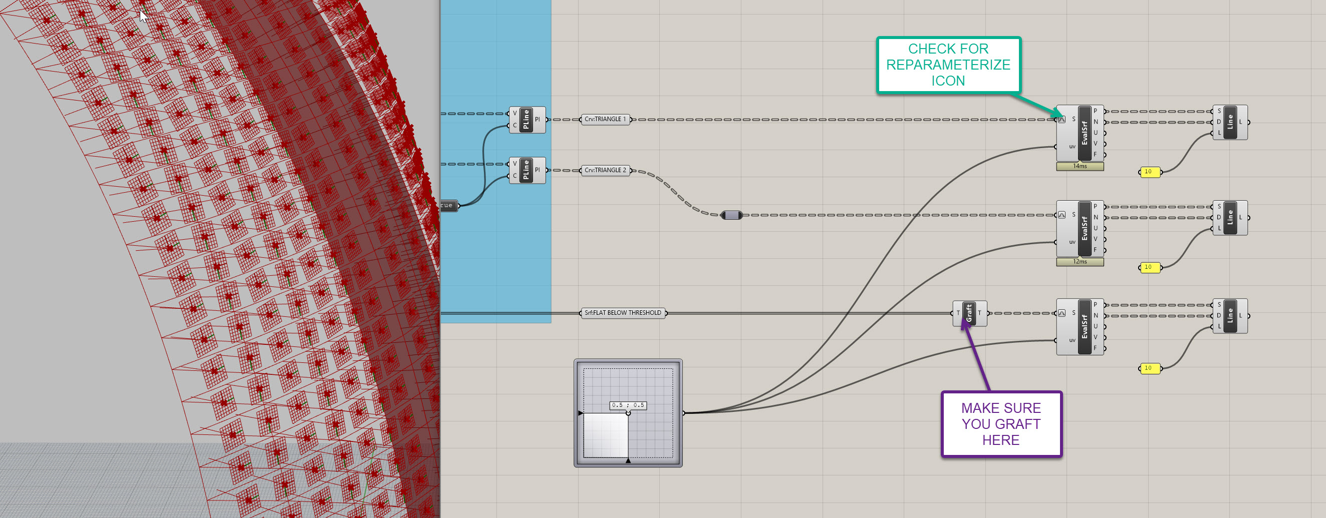 Line SDL (Line)component. This is yet another incredibly helpful component. Plug the P and N from theEvaluate Surface (EvalSrf)component into the S and D of theLine SDL (Line)component, respectively. We are basically giving it a starting point and a direction based off our surface. We now need to give it a length - this can be a fixed number, so create aPanel ()component, set it to a value of 10, and plug it in to the L on theLine SDL (Line)component. Now, copy and past theEvaluate Surface (EvalSrf)and theLine SDL (Line)components two times, and and replace the two new S inputs with your second set of triangles and your flattened 4 sided panels. You can use the sameMD Sliderto fee all three. The last step is to graft the 4 sided surfaces using aGraft Tree (Graft)component so the data structure matches the triangles (each element in its own branch). Your definition and model should look like the following: