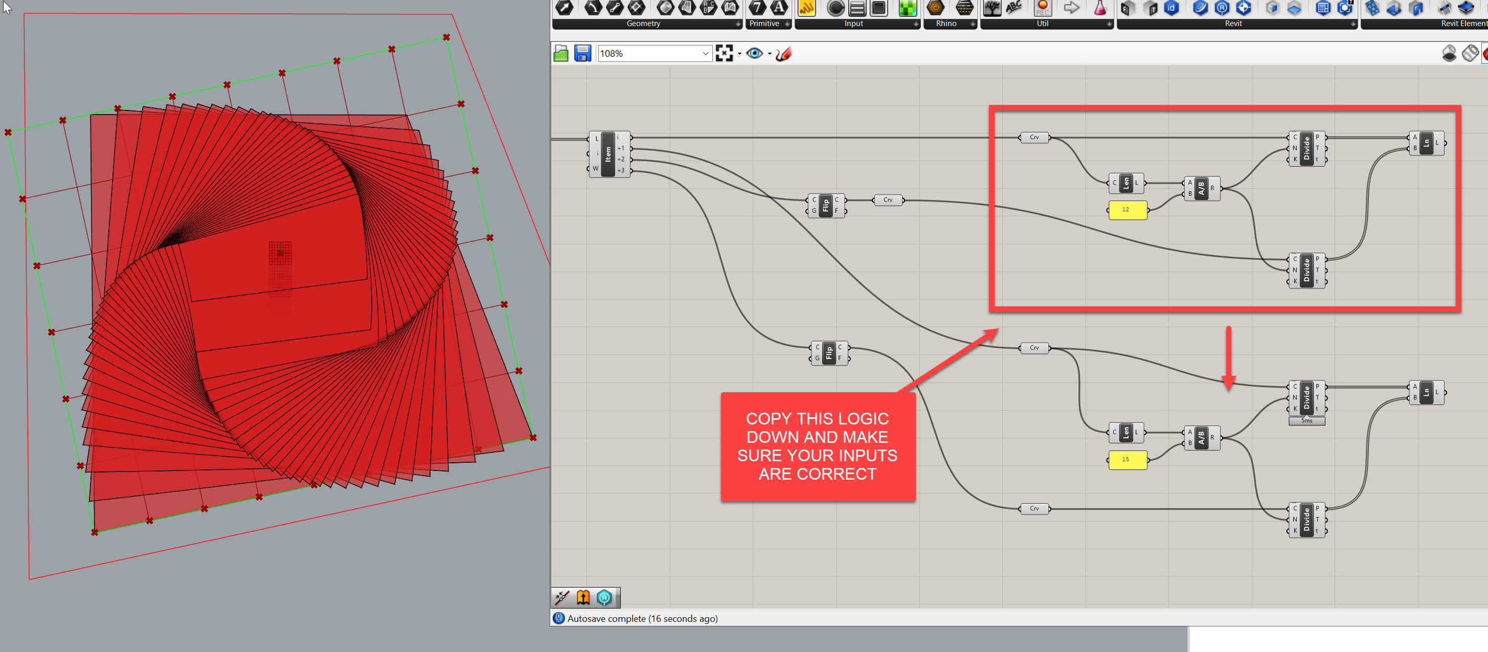 Side Challenge: Can you set up variable spacing (e.g., an A/B pattern or a tighter grid near the core)? Try using an Evaluate Curve component instead of a Divide Curve