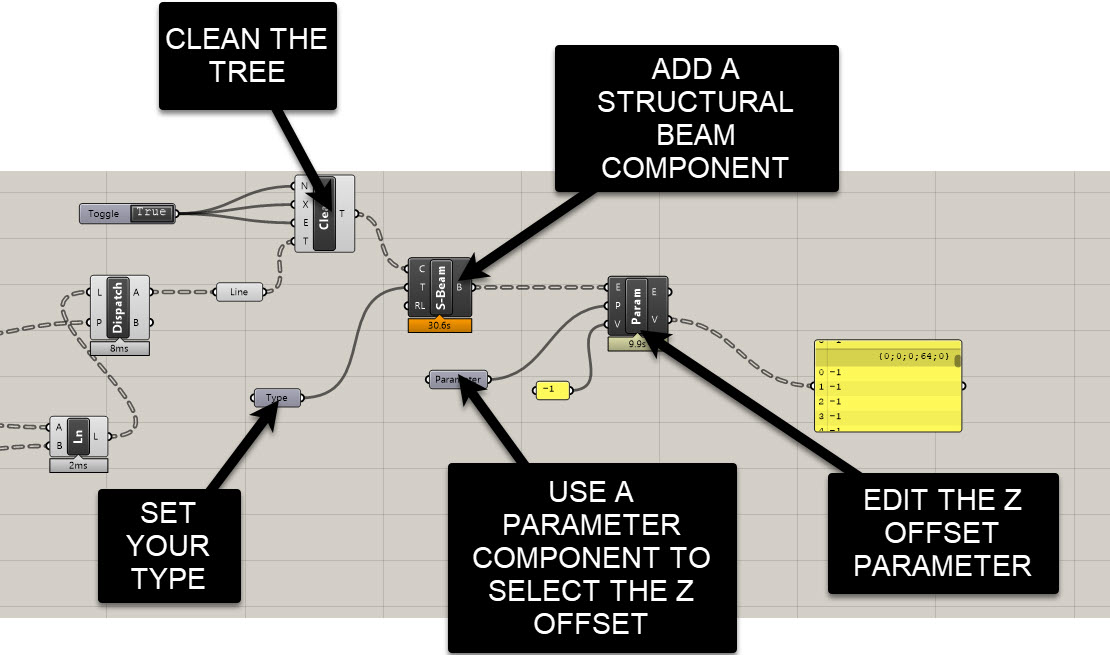 Revit places beams by centerline, so you’ll often need a negative Z Offset to drop them under the slab soffit.- Use Element Parameter (get/set) for your placed beams